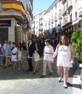 Una representación del Grupo Joven ha participado en la procesión del Corpus Christi por las calles de Jaén. Nuestros jóvenes han portado su insignia y han caminado delante de la representación de la Junta de Gobierno de la Hermandad en la procesión más importante de cuantas recorren la ciudad.