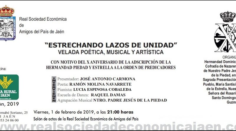 Para conmemorar este acontecimiento, nuestra Hermandad, en colaboración con la Real Sociedad Económica de Amigos del País organiza una Velada poética, musical y artística en la que participarán: