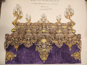 El paso realizado en madera de cedro real y terminación en color caoba, intercala orfebrería dorada con distintos motivos vegetales y candelabros en pan de oro, así como piezas bordadas en los respiraderos, que aportan luminosidad al paso y variedad ornamental.