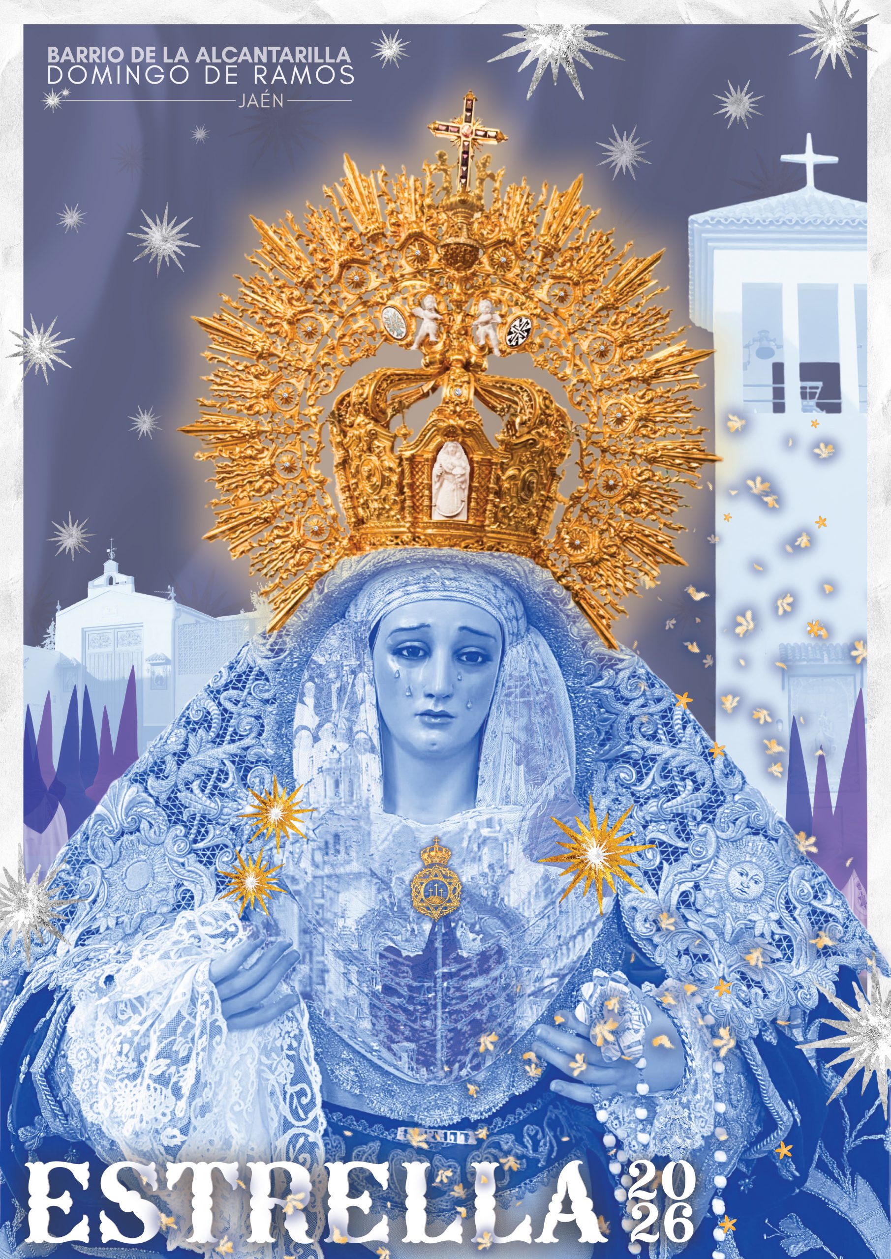Centrándonos en esta obra para la Santísima y Venerada Virgen de la Estrella, quería que transmitiese mucha alegría pero sobre todo identidad de la hermandad. Predominan los colores propios de esta; diversos tonos de celeste y azul. Así como su casa hermandad y la torre de la iglesia dominica custodiando a la Virgen a ambos lados.