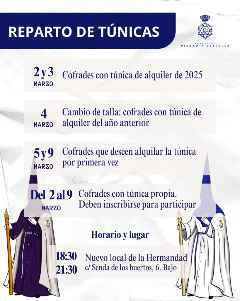 NOVEDAD: el reparto de túnicas se realizará en el nuevo local de la Hermandad (calle Senda de los huertos, 6, bajo)