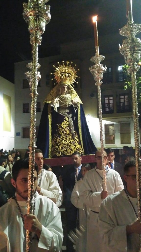 El cortejo comenzará a las 21:30 h. con el rezo de la corona dolorosa. Los devotos pueden recoger una vela a la salida de la iglesia para alumbrar el camino de María hasta su trono.