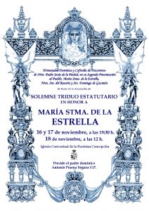 Celebramos el Solemne Triduo Estatutario en Honor a María Stma. de la Estrella los próximos 16, 17 y 18 de noviembre en la Iglesia Conventual de la Purísima Concepción, comenzando el 16 y el 17 a las 19:30 horas y el tercer y último día, el 18, a las 12:00 horas.