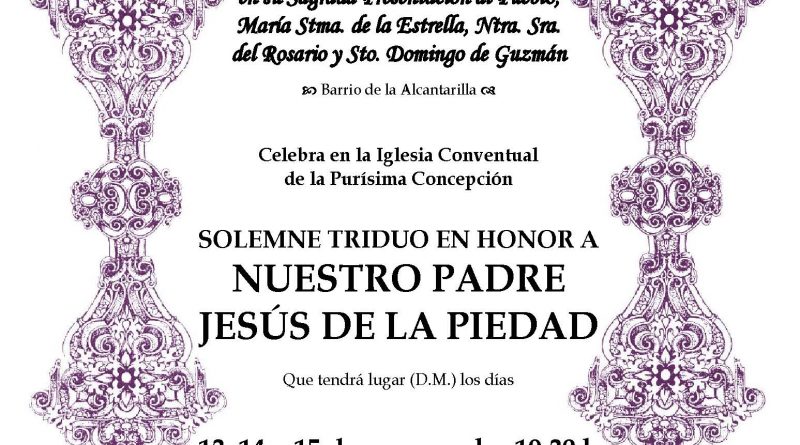 Durante el próximo fin de semana, 13, 14 y 15 de marzo, celebraremos en la Iglesia Conventual de la Purísima Concepción el Solemne Triduo Estatutario en Honor a Ntro. Padre Jesús de la Piedad, dando comienzo a las 19:30 horas con el Rezo del Santo Rosario, Ejercicio del Triduo y Eucaristía.