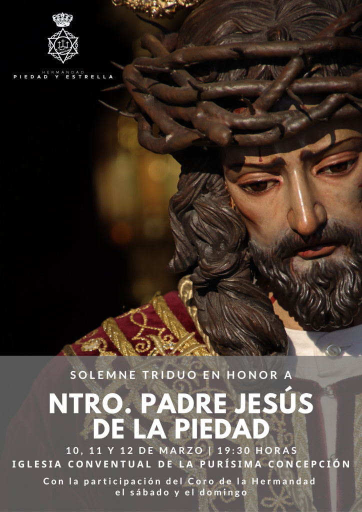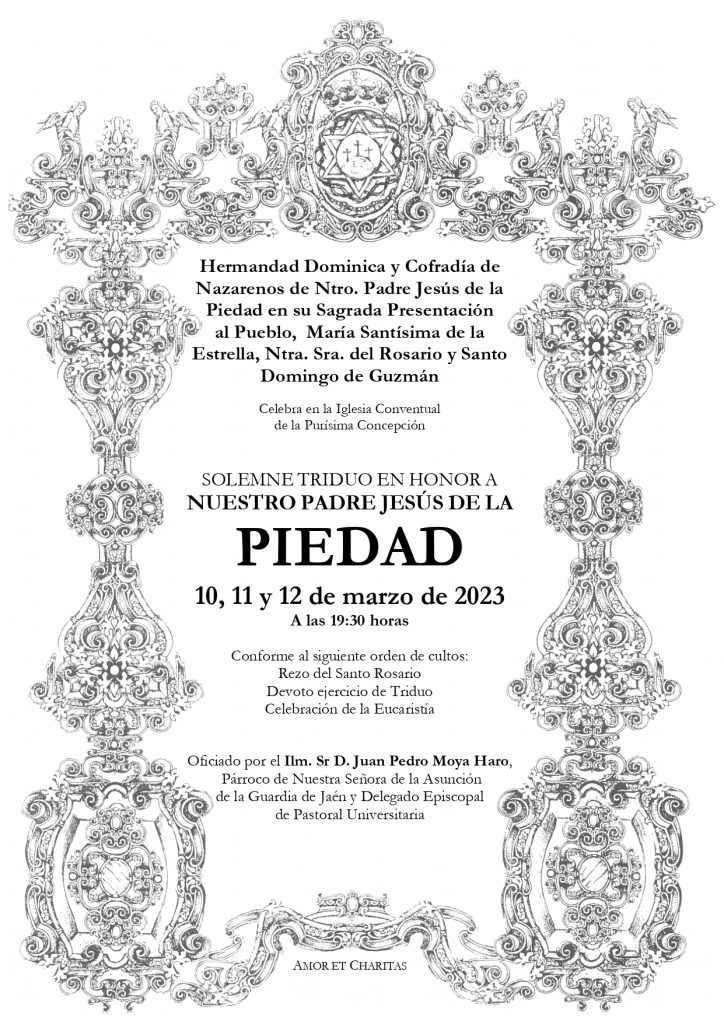 La Hermandad Piedad y Estrella celebra esta Cuaresma en la Iglesia Conventual de la Purísima Concepción el Triduo en honor a Nuestro Padre Jesús de la Piedad. Será los días 10, 11 y 12 de marzo, a partir de las 19:30 horas y será oficiado por el Ilmo. Sr. D. Juan Pedro Moya Haro, párroco de Nuestra Señora de la Asunción de La Guardia de Jaén y Delegado Episcopal de Pastoral Universitaria.