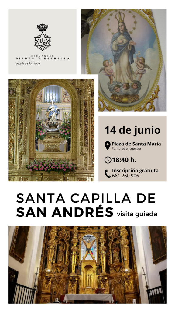 La Vocalía de Formación organiza para el viernes 14 de junio una visita guiada a la Santa Capilla de San Andrés, una de las iglesias menos conocidas de la ciudad, que se encuentra en plena judería. El propio secretario de la Cofradía de la Santa Capilla y Noble Cofradía de la Limpia Concepción de Nuestra Señora será quien nos acompañe e ilustre sobre la historia y detalles de valor patrimonial que atesora esta iglesia que tiene sus raíces en un templo mudéjar.
