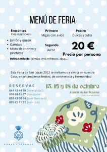 Mediante reserva previa, se ofrecerá un menú de feria al mediodía al precio de 20 euros por persona (con bebida incluida) en el que degustaremos platos típicos de la feria, como las migas con avíos o el arroz.