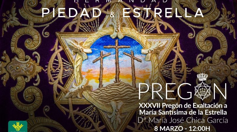 El próximo 8 de marzo a las 12 horas en el Auditorio Sierra Mágina de Caja Rural de Jaén sito en el Palacio de Congresos de Jaén se celebrará el XXXVII Pregón de Exaltación a María Santísima de la Estrella que será pregonada por Dª. María José Chica García presentada por antecesor D. Diego Montiel Serrano.